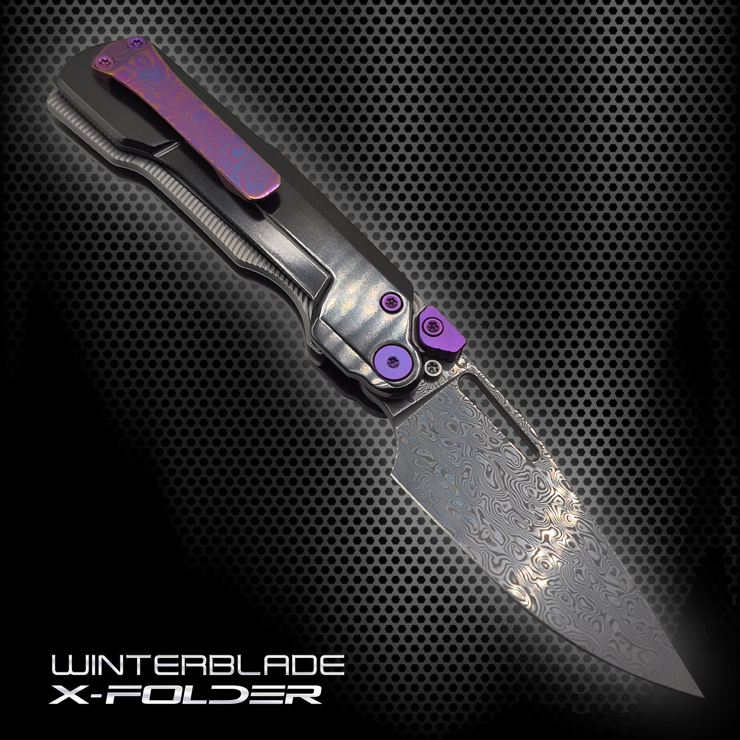 X-FOLDER: POLISHED ZIRCONIUM HANDLE + DAMASCUS BLADE + PURPLE TIMASCUS CLIP